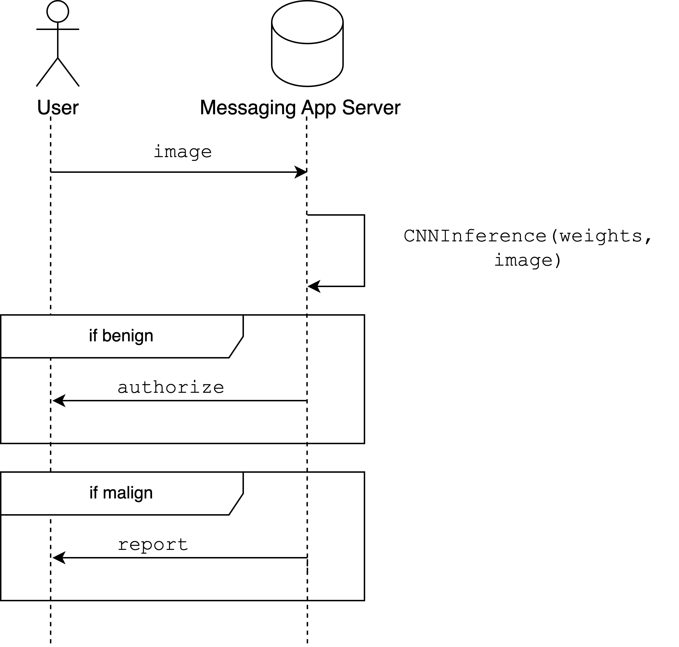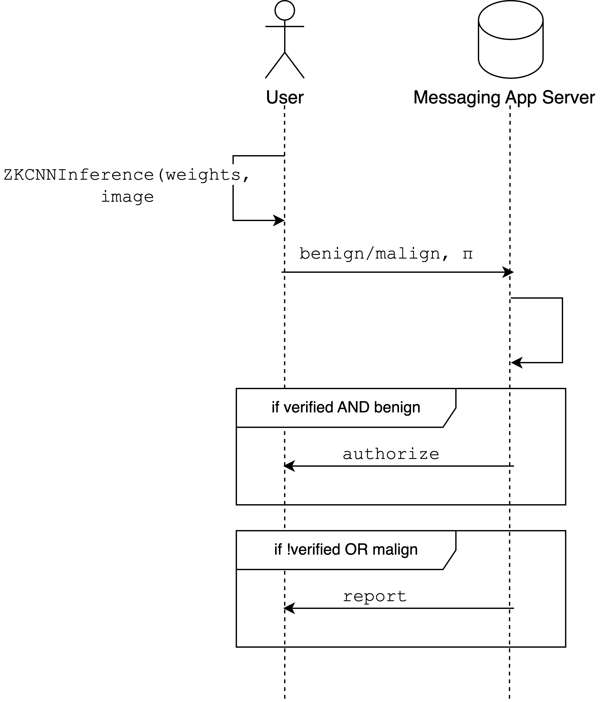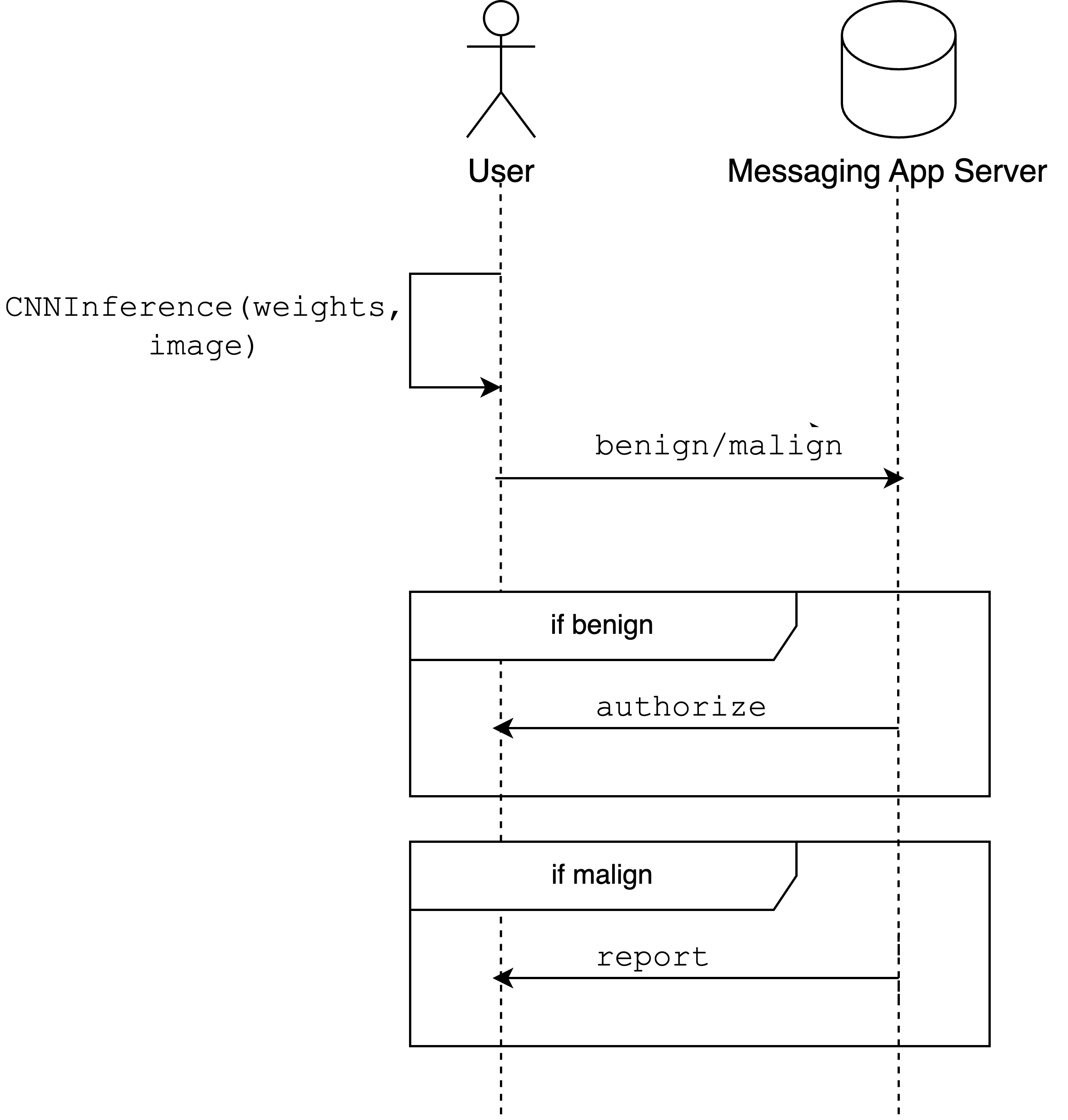 This solution would protect the User's data, but there's a caveat here: from a system design perspective, we require the messaging app not to access any bit of the user's computation. So how can the server be assured that the User runs the expected model, not a dummy function that always returns benign? Alternatively, how can the server be assured that this model wasn't run on an image different from the one the User will share with one of their contacts?